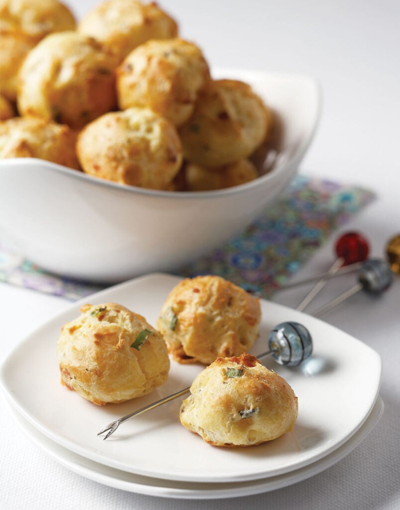 Serve gougères warm or at room temperature. They work well for cocktail parties, afternoon tea, or wine tastings.