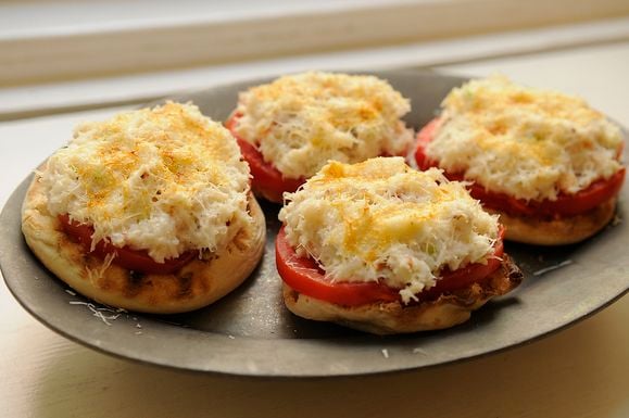 Mix crab meat with mayonnaise, cheese, and your favorite seasonings. Spoon this mixture onto each piece of toast.
