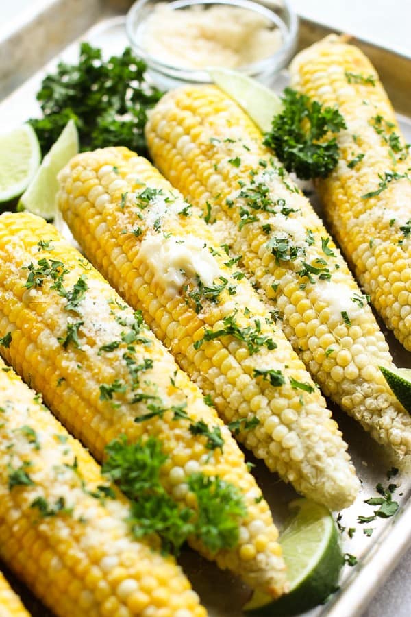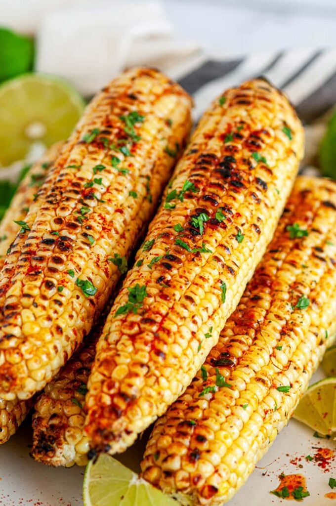 This Mexican-inspired dish combines sweet roasted corn with tangy lime and spicy chili powder. You can roast corn in the oven at 400°F for 30-40 minutes in their husks.