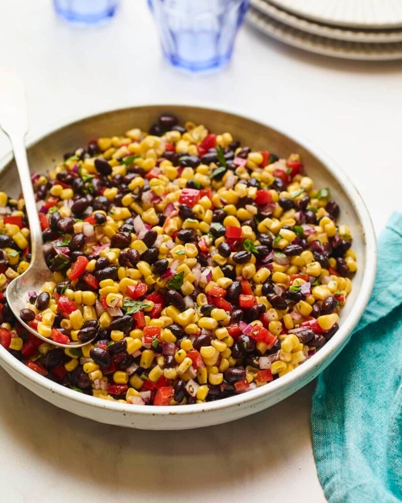 Corn and black bean salad is very popular. It combines sweet corn with black beans, peppers, and lime dressing.