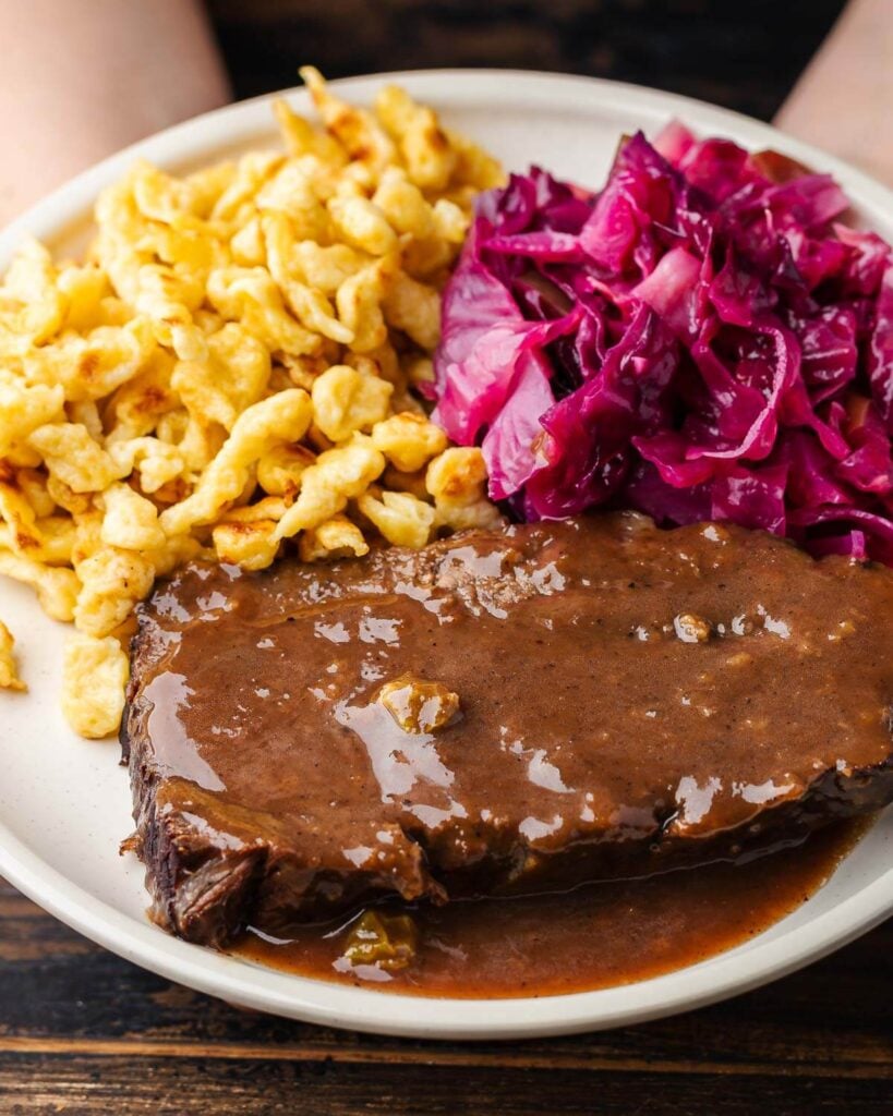 Sauerbraten represents traditional German pot roast cooking. The meat marinates for days in vinegar and spices.