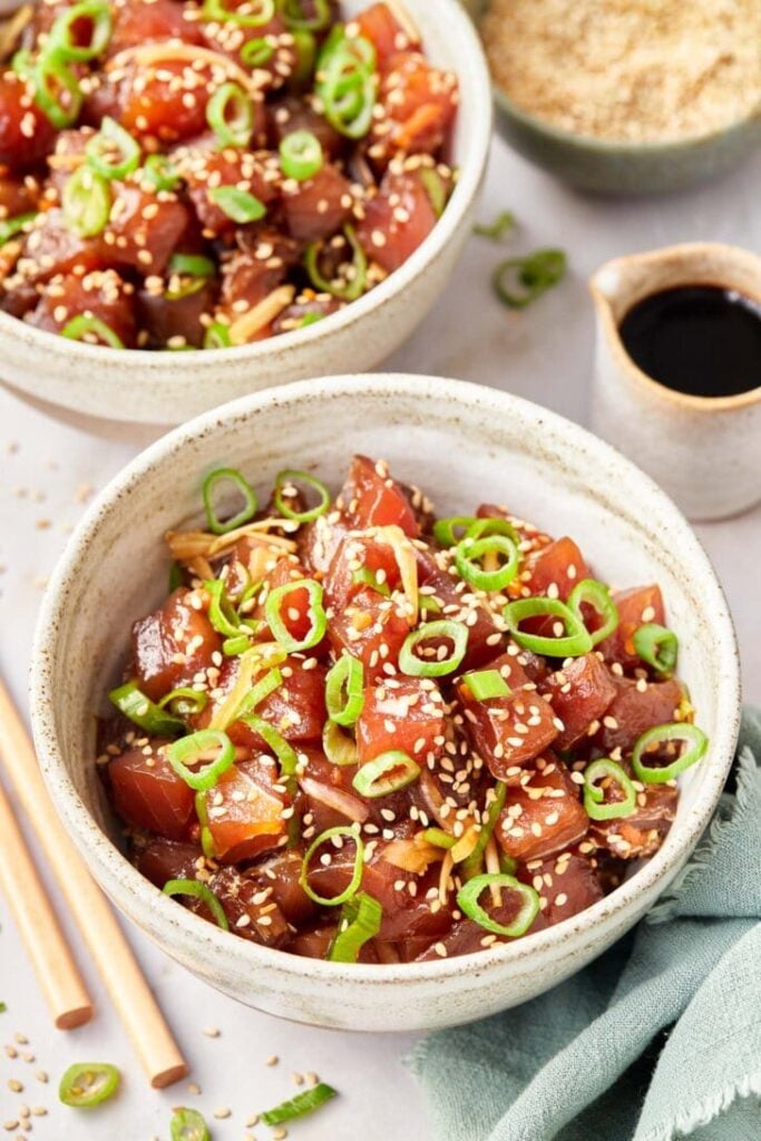 Serve your poke over rice or eat it as an appetizer. The buttery tuna pairs perfectly with the salty marinade.