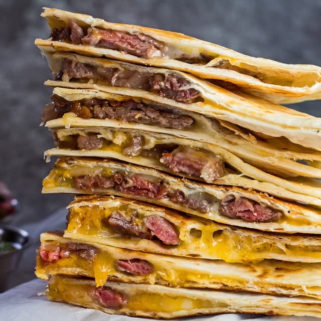 Place the beef between two flour tortillas with shredded cheese. Cheddar, Monterey Jack, or a Mexican cheese blend work well.