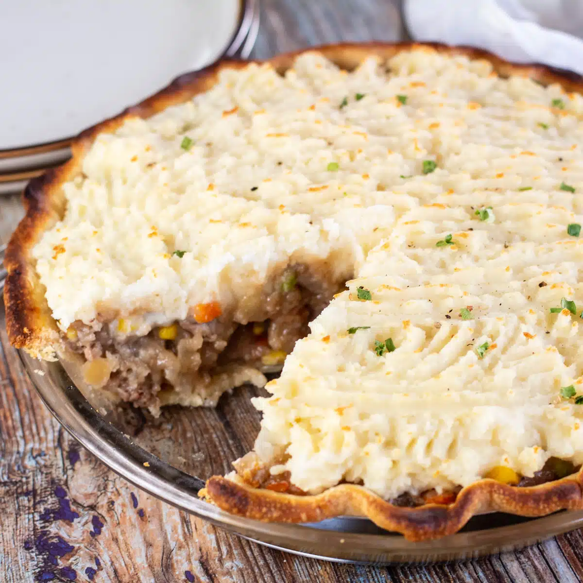 Top with mashed potatoes or puff pastry. Bake until golden brown and heated through.