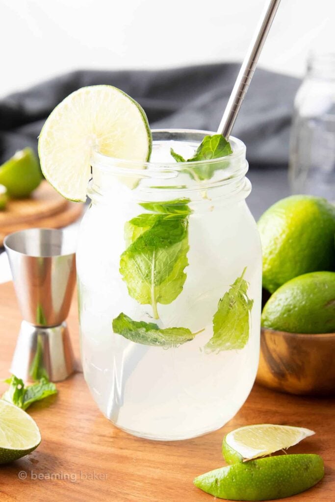 Make a Virgin Mojito with mint, lime juice, sugar, and soda water. This recipe uses four ingredients and takes under five minutes.