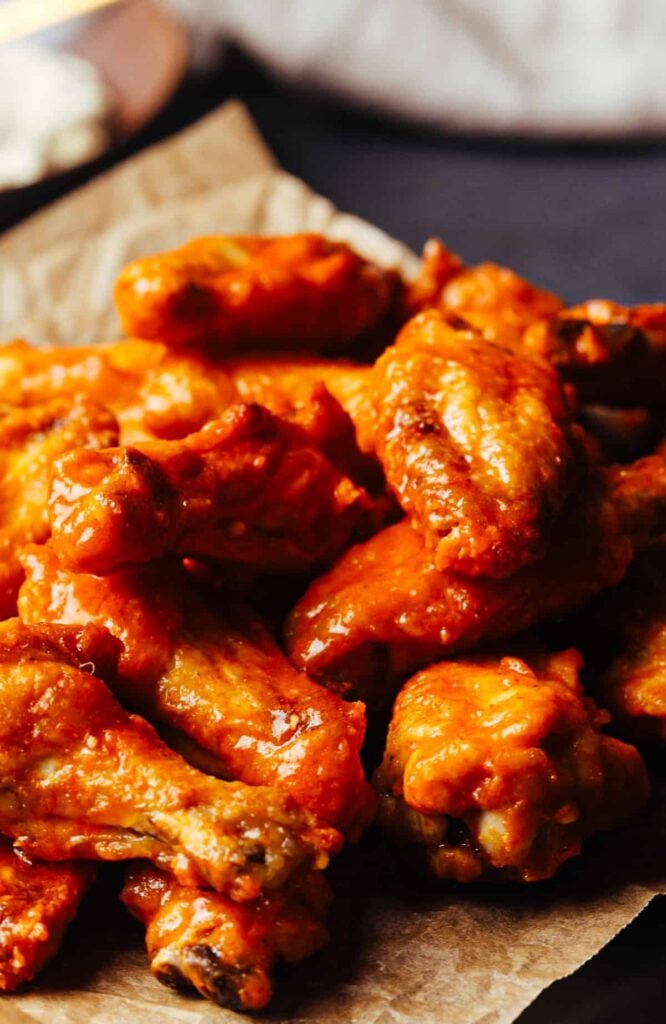 You bake or fry the wings, toss them in buffalo sauce, and serve them with ranch or blue cheese dressing on the side.