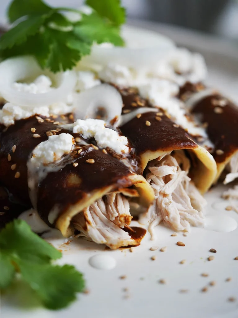 Prepare these enchiladas by dipping tortillas in the mole sauce and filling them with chicken and cheese. Bake until warm, then top with queso fresco, sesame seeds, and fresh cilantro.