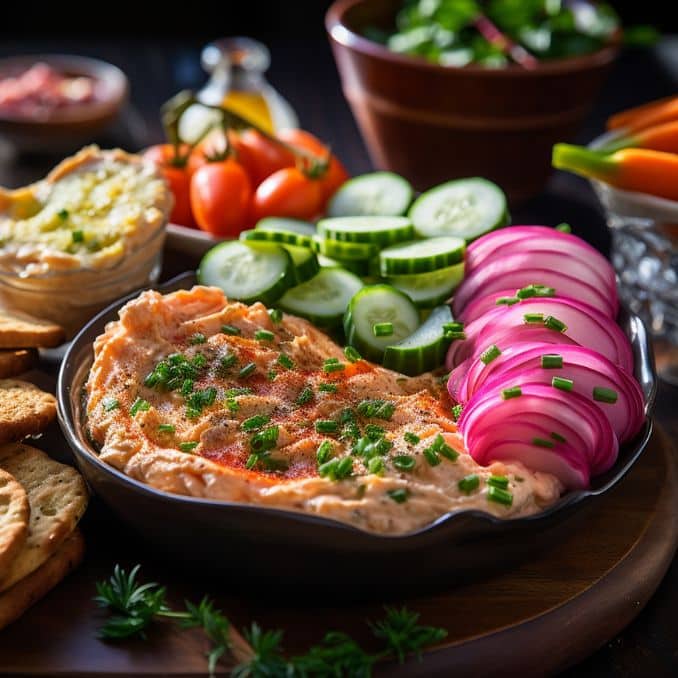 Serve the spread as an appetizer with crackers or vegetables. You can also use it on bagels or toast for a quick snack.