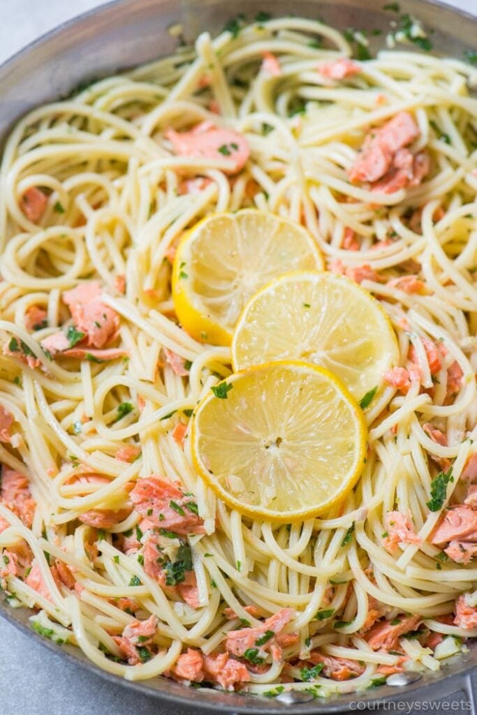 Salmon pasta with lemon sauce makes a quick weeknight dinner. Cook your favorite pasta, then toss it with canned salmon, cream, lemon juice, and garlic.