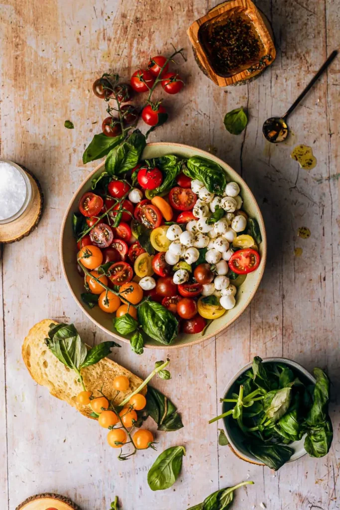 You’ll need about 2 pints of halved cherry tomatoes and fresh mozzarella pearls. Add whole or torn basil leaves, then drizzle with your dressing before serving.