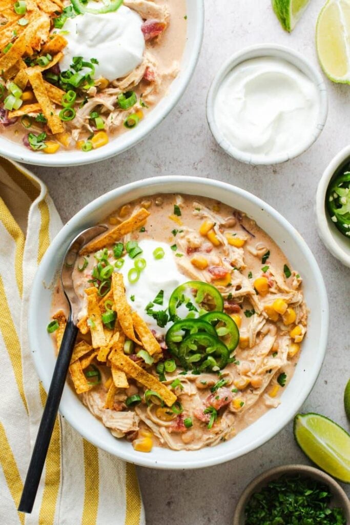 Chicken chili with beans is a perfect crockpot recipe for busy weeknights. You can use chicken breasts or thighs, along with your choice of beans like black beans, white beans, or pinto beans.