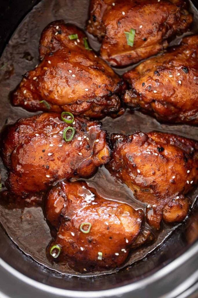 The sauce becomes sticky and sweet while the chicken stays tender. Bone-in thighs work best because they stay moist during the long cooking time.