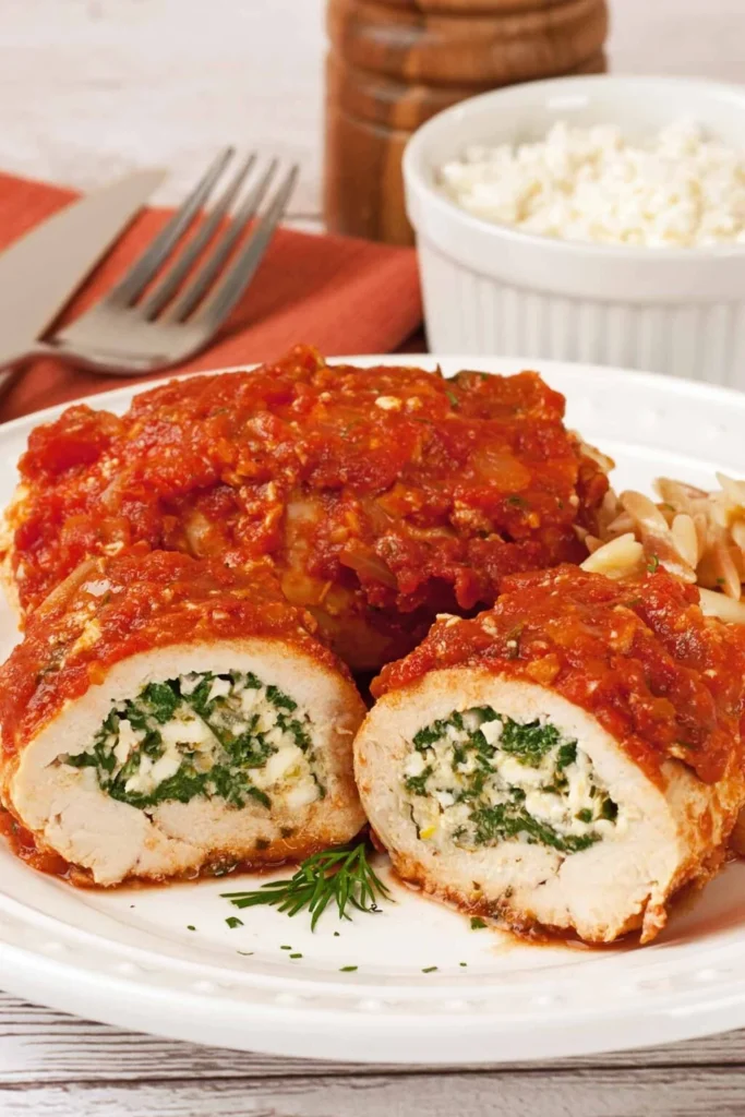Some recipes include sun-dried tomatoes or black olives for extra flavor. Sear the stuffed chicken in a pan, then finish cooking it in the oven.