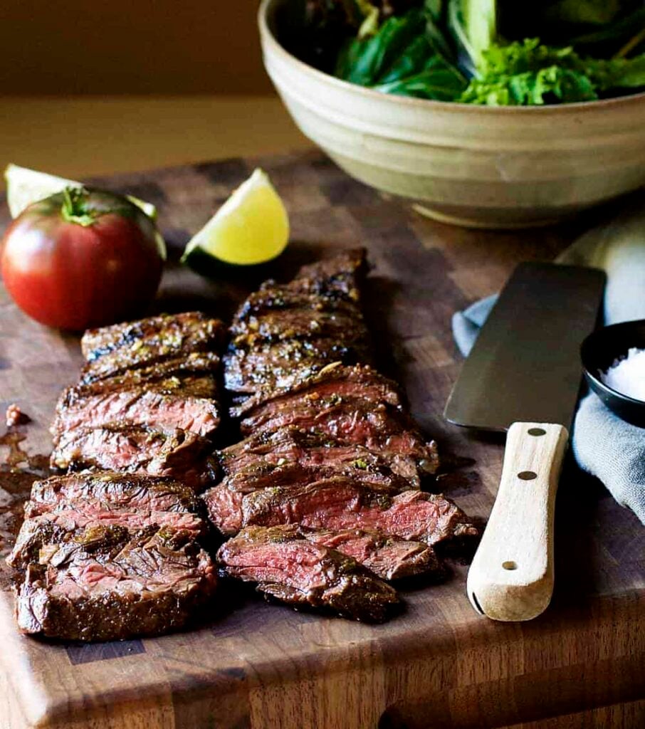 Grill the meat over high heat to get a nice char on the outside while keeping the inside tender. After grilling, slice the steak thin against the grain.