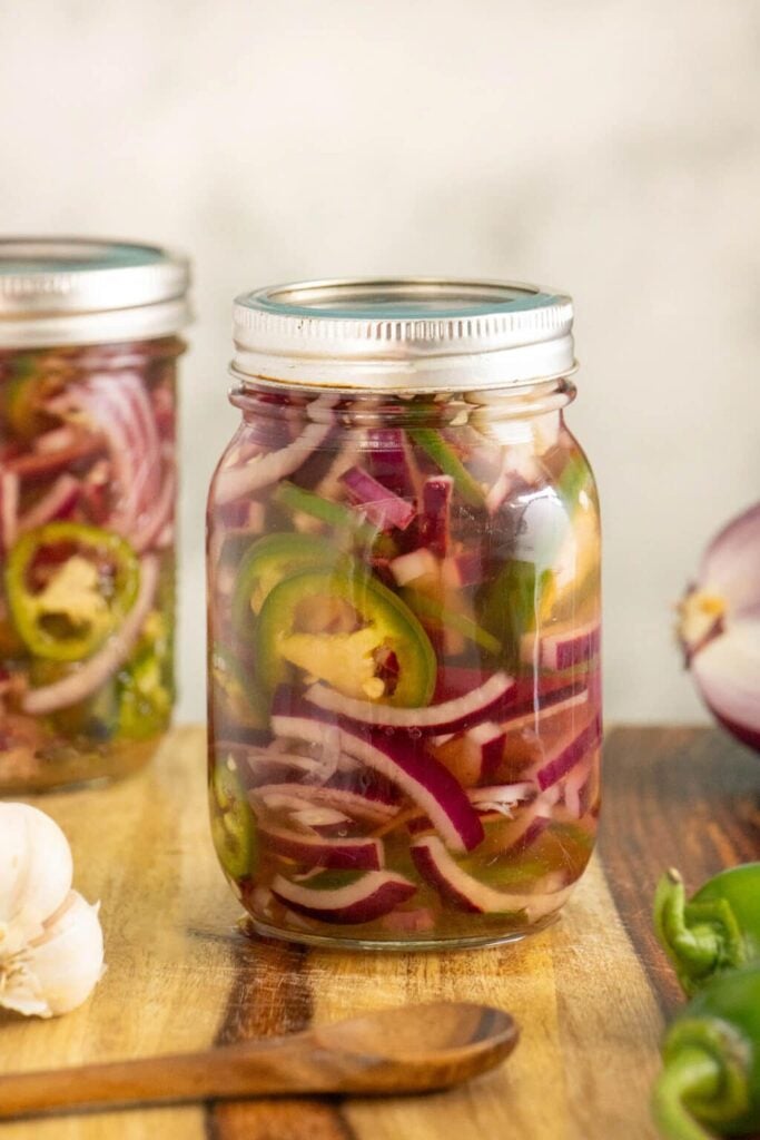 Slice your jalapeños and onions, then pour hot brine over them in a jar. They’re ready to eat within an hour, but taste better after sitting overnight in the fridge.