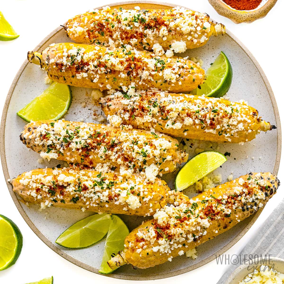 The classic preparation includes a coating of mayo and sour cream mixed with seasonings. Top the corn with crumbled cotija cheese, chili powder, and fresh lime juice.