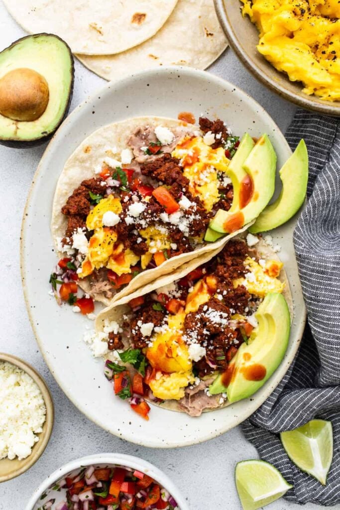 Start with fluffy scrambled eggs and spicy chorizo as your main proteins. Warm soft tortillas and set out toppings like shredded cheese, diced avocado, and fresh cilantro.