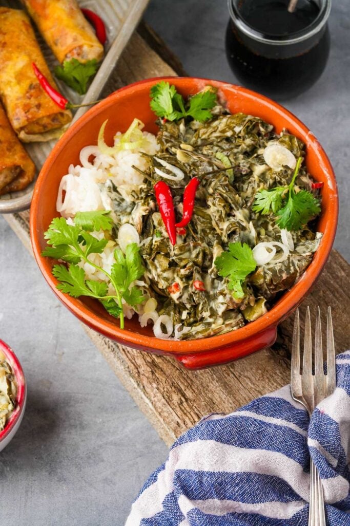 You can make it with just vegetables or add pork, shrimp, or fish. The taro leaves need to cook for a long time in the coconut milk.