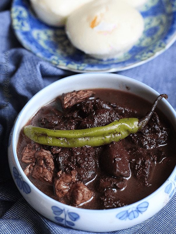 You’ll find tender pieces of pork belly or shoulder cooked in a thick sauce. The blood gives the stew its signature color and adds depth to the taste.