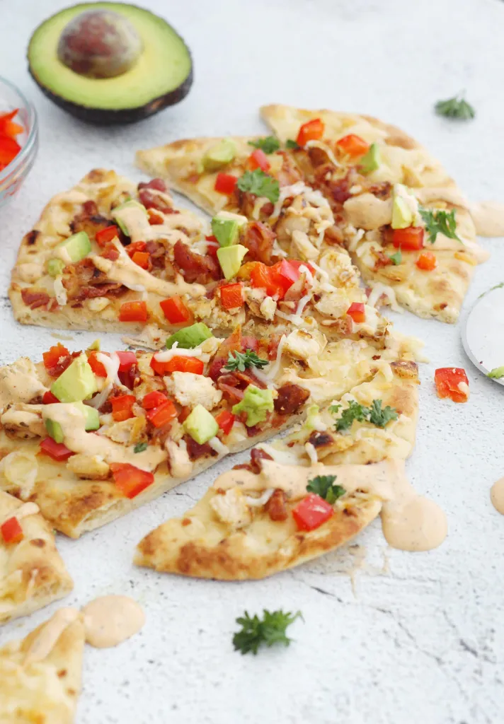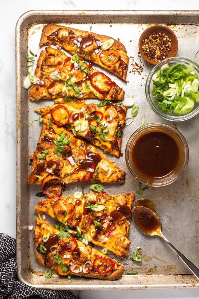Start with store-bought flatbread or naan as your base. Spread BBQ sauce on top, then add shredded rotisserie chicken or leftover grilled chicken.