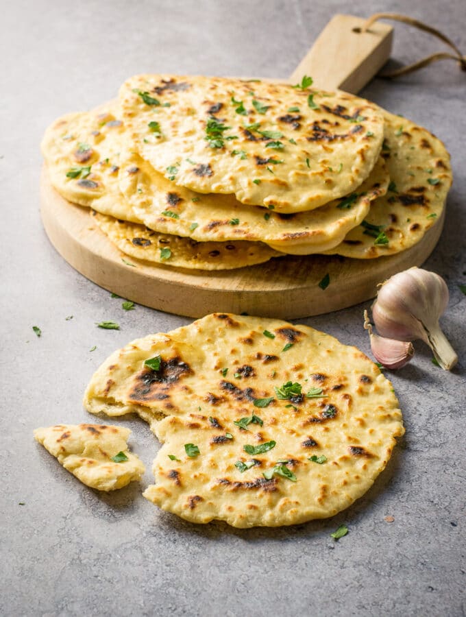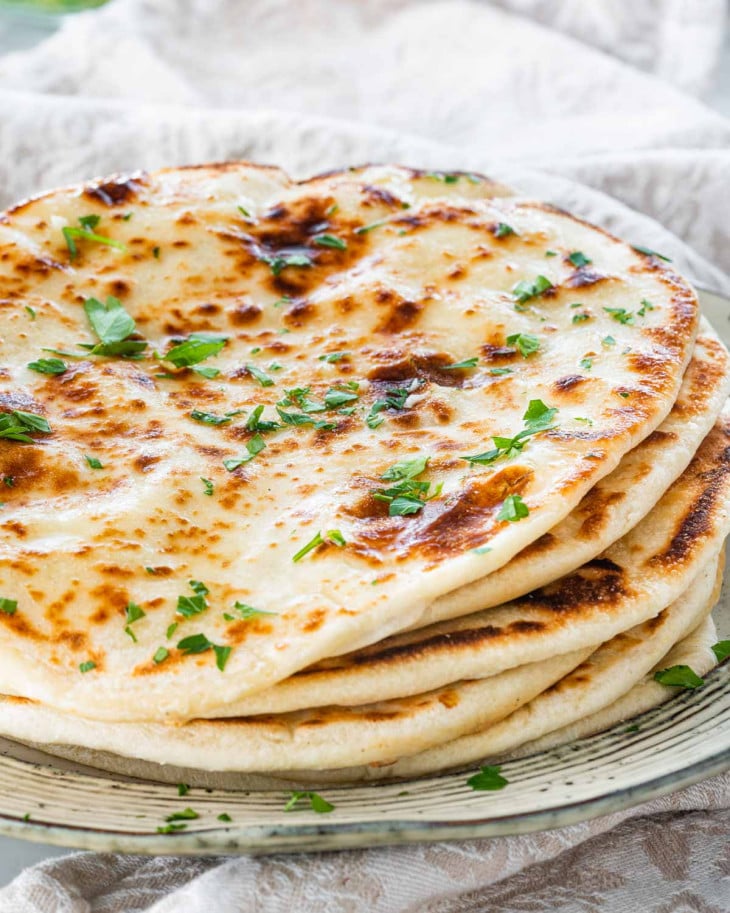 The dough includes yogurt and milk, which create a tender texture. Cook it in a hot skillet until golden with slight charring.