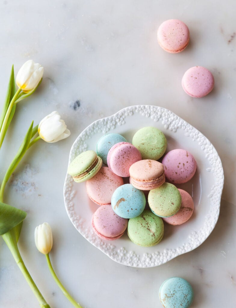 Macarons are delicate French sandwich cookies made from almond flour, powdered sugar, and whipped egg whites. These treats have a crisp outer shell and a soft, chewy center.