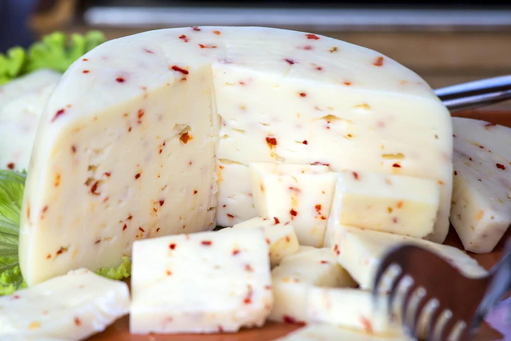 Pepper jack cheese brings a zesty kick to your burger. This semi-soft cheese melts smoothly over your patty while adding spicy flavor from jalapeños and other peppers mixed into it.