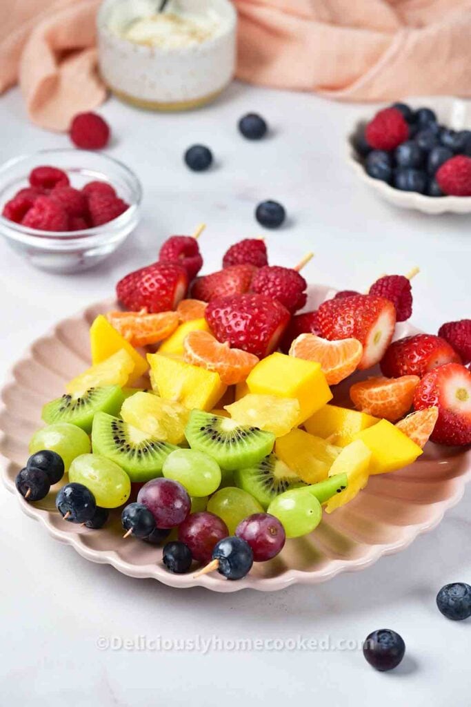 Serve Rainbow Fruit Skewers as a colorful appetizer or dessert. Adults and children both enjoy the fresh, sweet flavors and fun presentation.