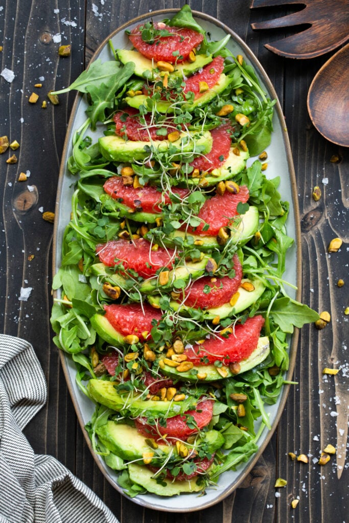 You can combine grapefruit with leafy greens like arugula or spinach. The peppery notes in these greens complement the fruit’s bitter-sweet taste.
