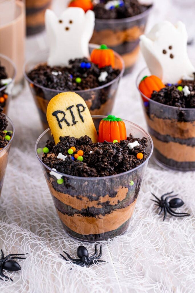 This no-bake recipe takes about 20 minutes to prepare. Top your cups with gummy worms, cookie tombstones, and other Halloween candies for decoration.