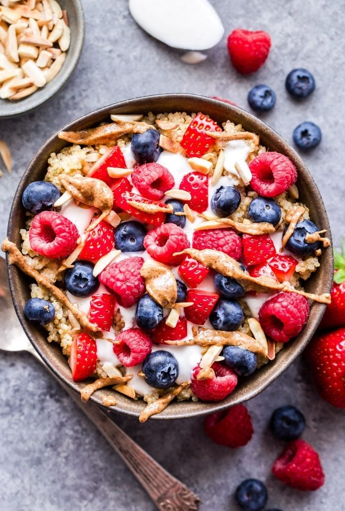 Prepare the quinoa ahead of time and store it in your fridge for quick assembly. Top your bowl with strawberries, blueberries, or raspberries based on what you have available.