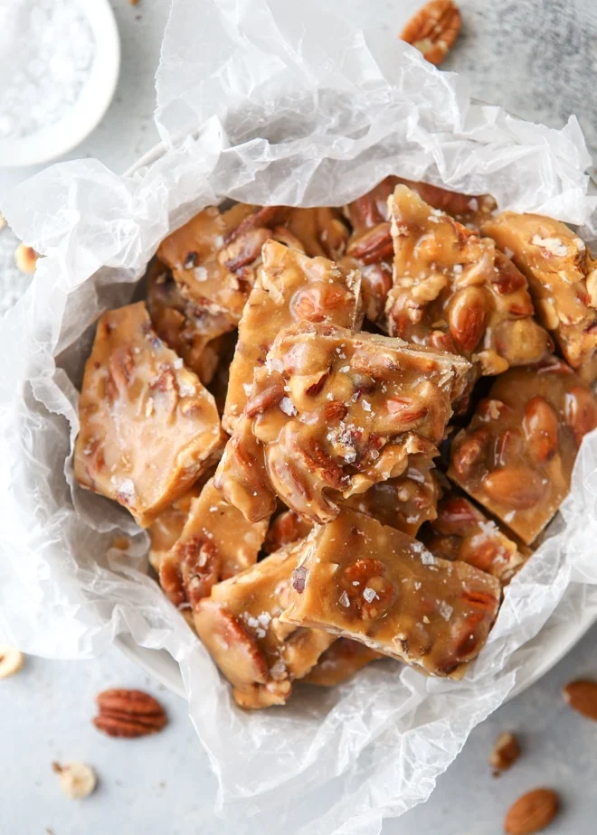 Salted nut brittle combines sweet caramelized sugar with crunchy nuts and a hint of salt. Make it with peanuts, almonds, cashews, or mixed nuts.