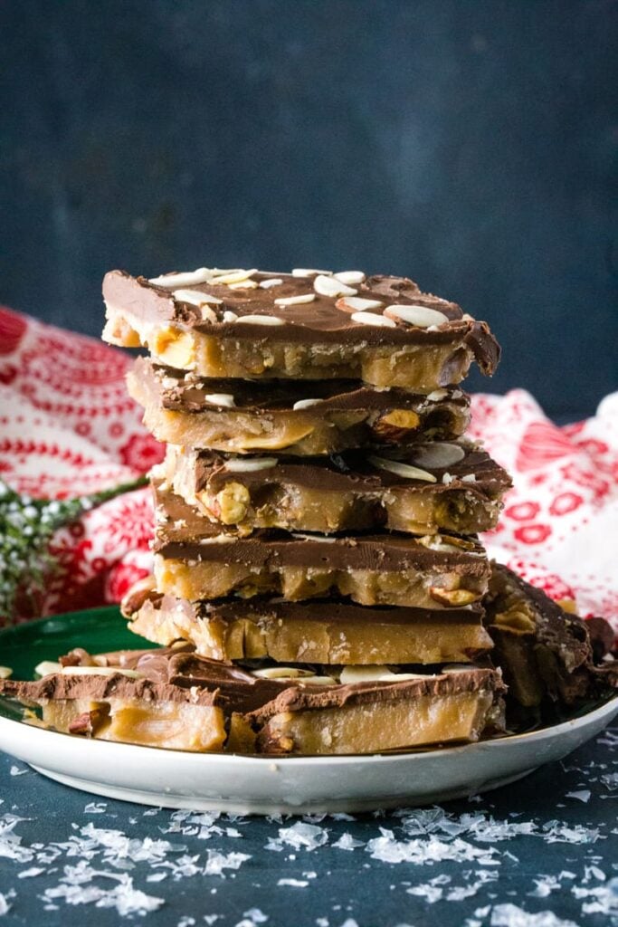 Use butter, sugar, and a candy thermometer to get the right temperature. Once your toffee sets, top it with melted chocolate and chopped nuts like almonds or pecans.