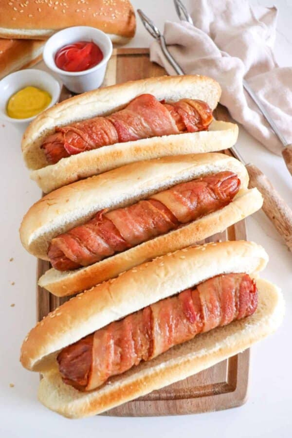 Wrapping your hot dogs in bacon adds a crispy, savory layer. Use thinly sliced bacon, preferably center-cut, which fits better around the hot dog.