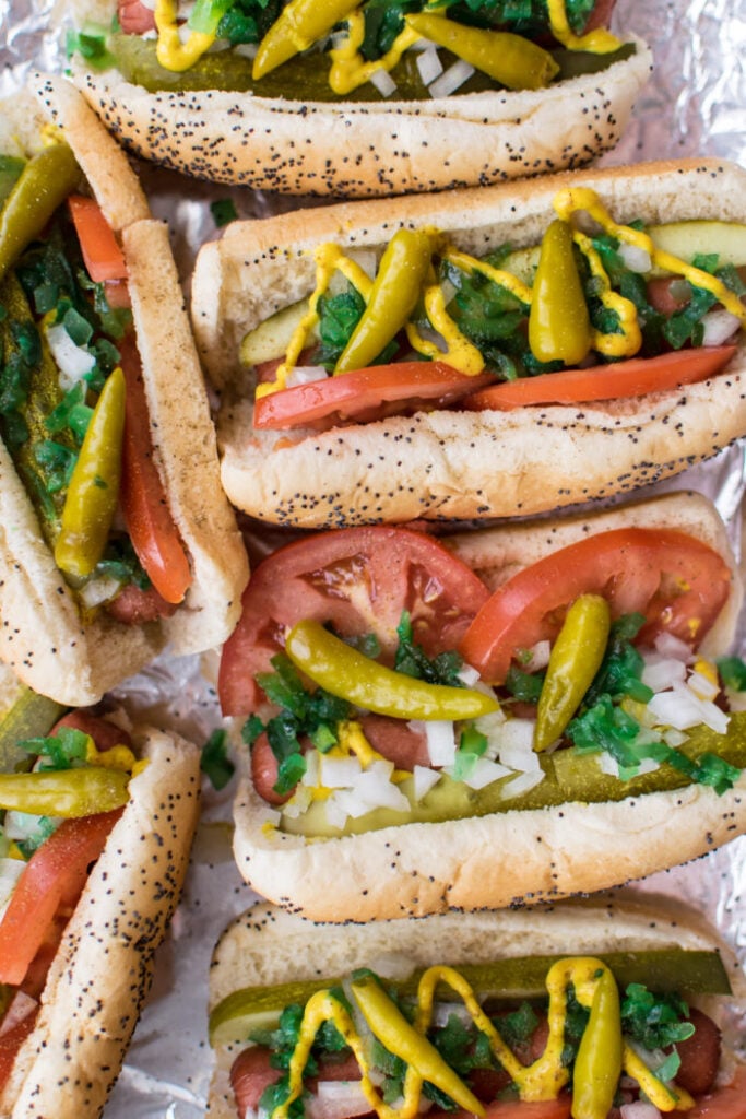 Chicago-Style: Yellow mustard, chopped onions, sweet pickle relish, tomato slices, sport peppers, celery salt, and a pickle spear