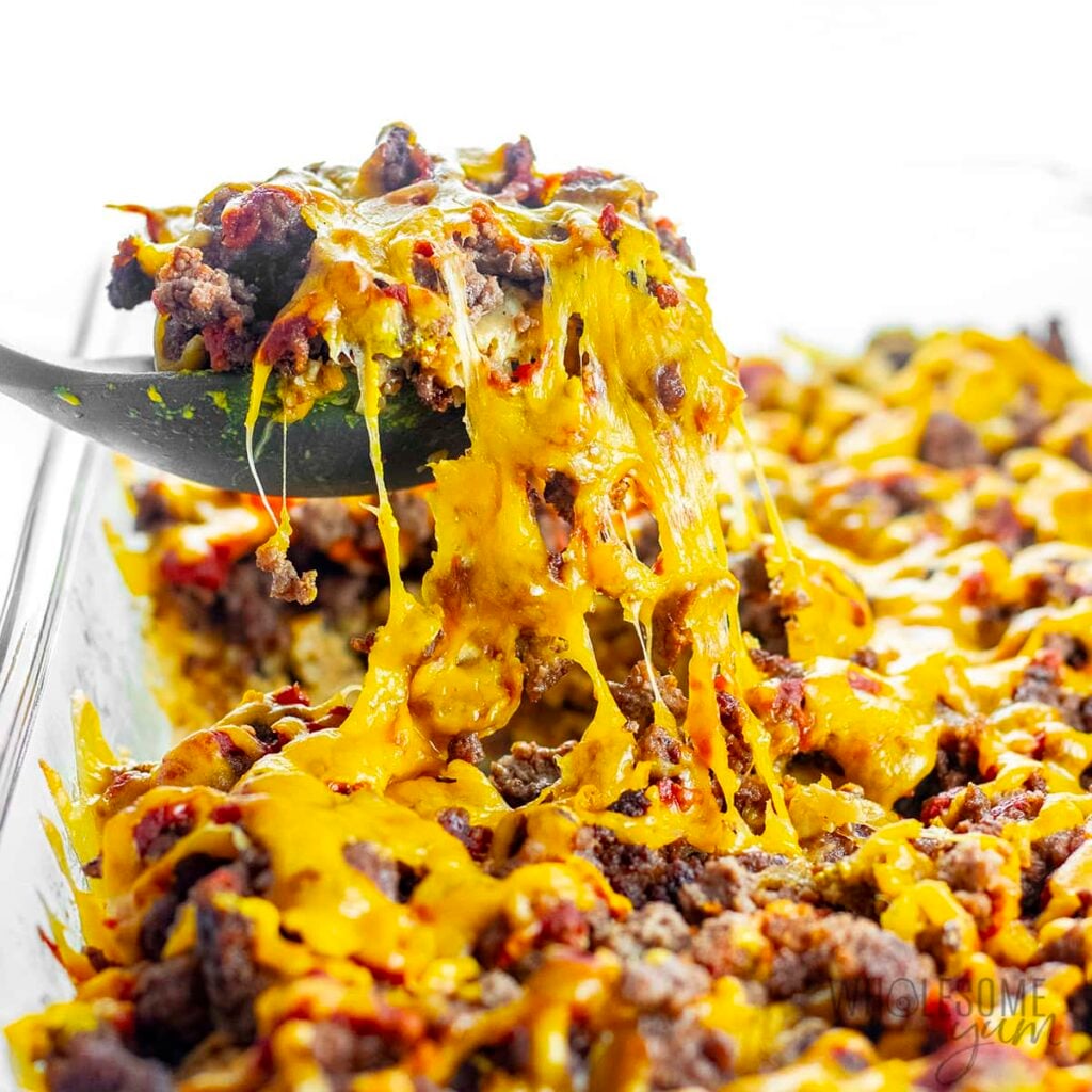 Keto Cheeseburger Casserole ranks as a top choice with only 4-5 grams of net carbs per serving. It gives you all the burger flavors without the bun.