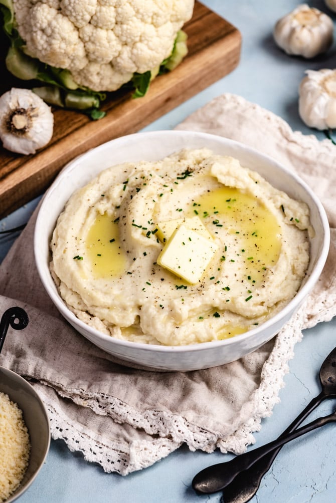 Cauliflower mash is a simple low-carb swap for traditional mashed potatoes. Cook cauliflower florets until tender, then blend them with butter, cream cheese, and parmesan.