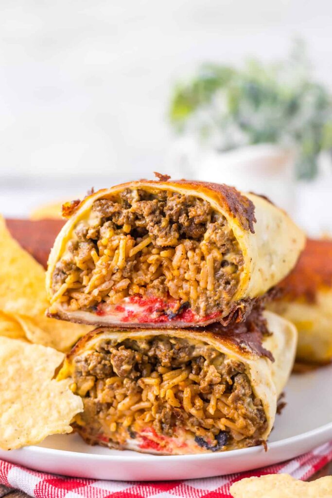 Spread warm queso cheese sauce down the center of your flour tortilla. Add the seasoned beef mixture, rice, and beans if you want.