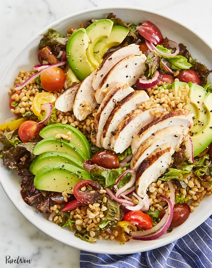This salad brings together grilled chicken with fresh vegetables in a simple, satisfying meal. Marinate boneless chicken breasts in lemon juice and herbs, then grill them to juicy perfection.