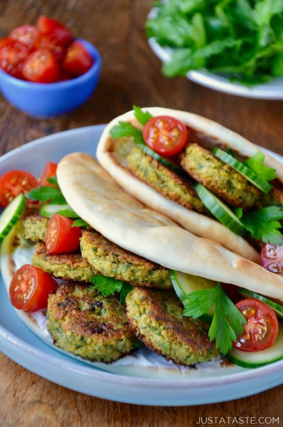 The creamy, tangy sauce balances the spiced chickpea patties perfectly.