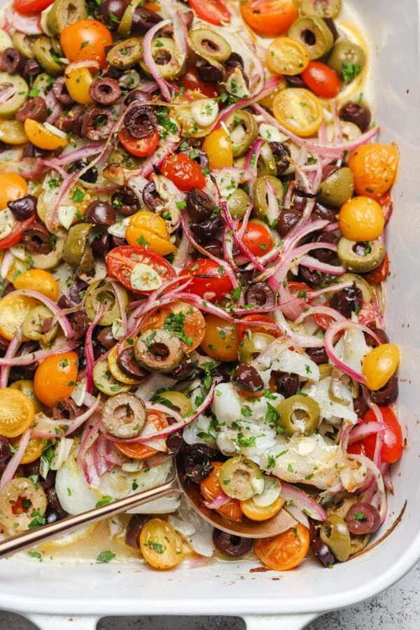 You’ll bake mild cod fillets with cherry tomatoes, kalamata olives, garlic, and olive oil.