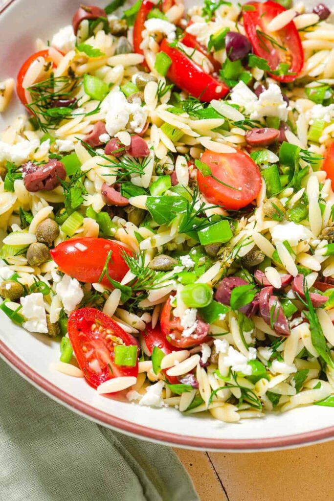 This pasta salad brings together orzo, fresh vegetables, and tangy feta cheese in one bowl.