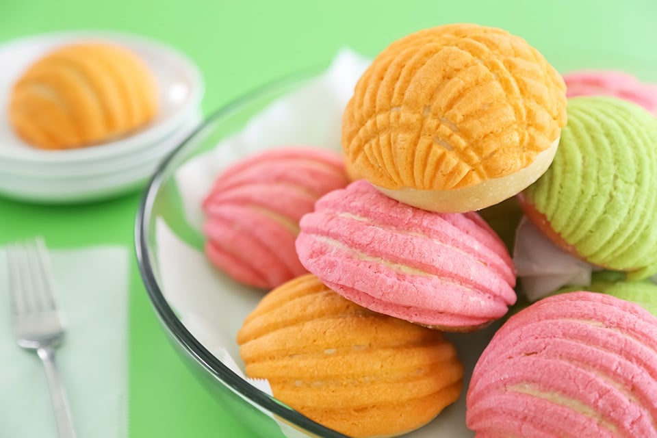 You can find conchas in traditional colors like white and chocolate. They’re named “conchas” because the scored pattern resembles a seashell.