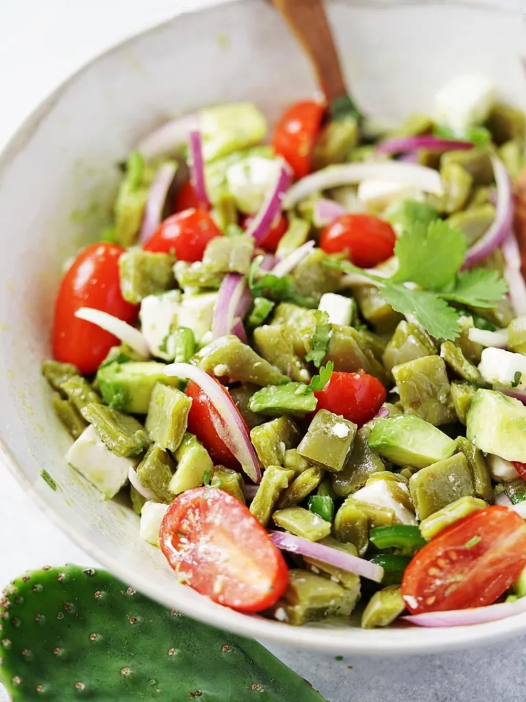 Nopal salad, or ensalada de nopales, brings a fresh taste to your table with cactus paddles as the star ingredient. This traditional Mexican dish combines tender nopales with tomatoes, onion, cilantro, and jalapeño.