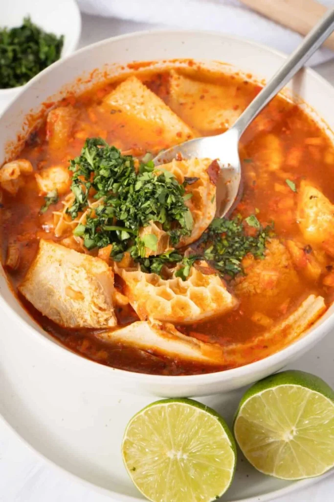 You’ll need hominy, dried chiles (usually guajillo or California chiles), garlic, and onions. Toast the chiles and blend them into a paste that gives menudo its red color and rich flavor.