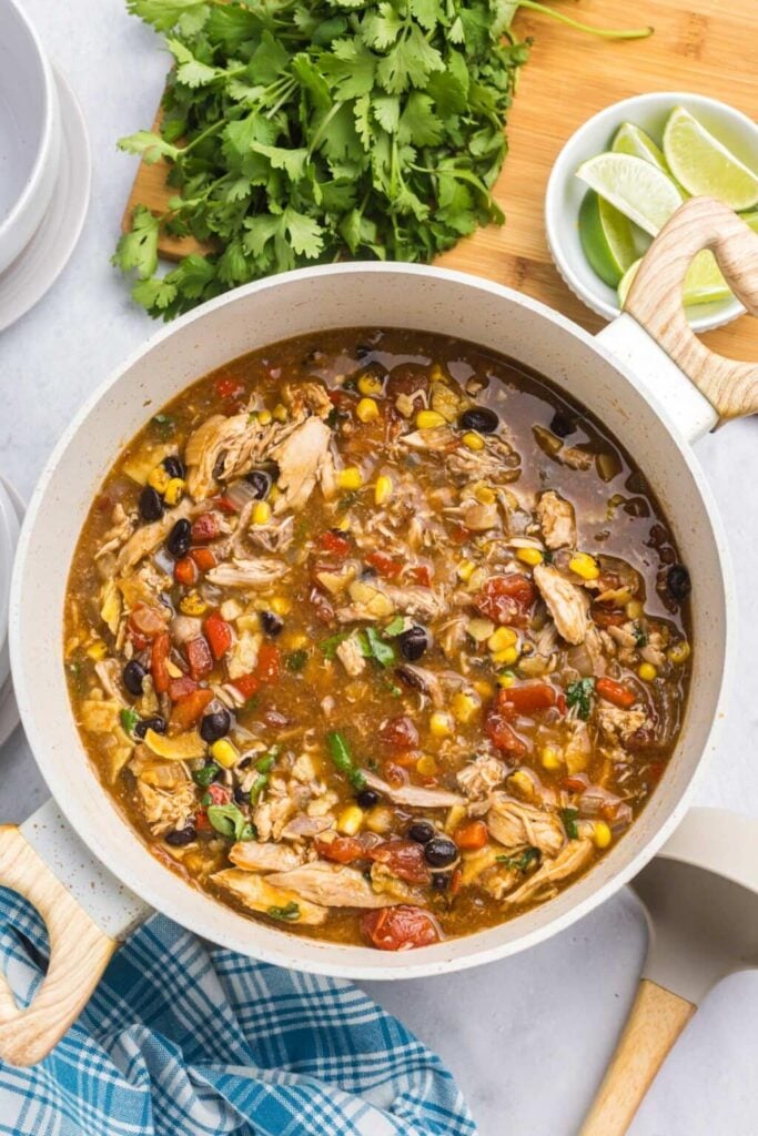 You can make the soup quickly in one pot. Use rotisserie chicken or leftover cooked chicken to save time.
