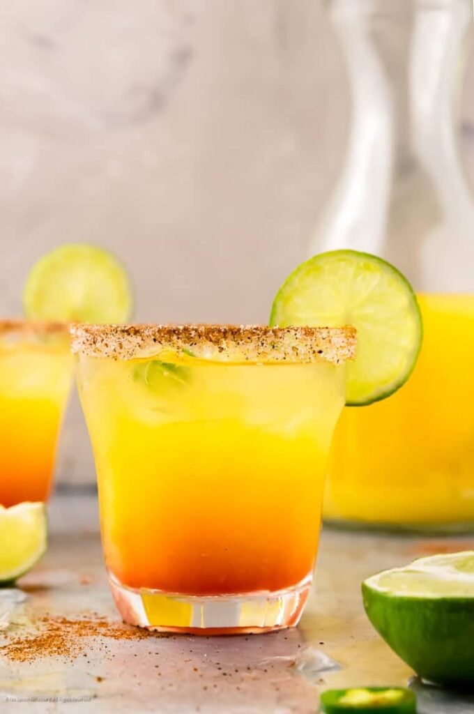 The drink layers yellow and red colors that look like a sunrise. The pineapple brings sweetness while the jalapeño adds fire.