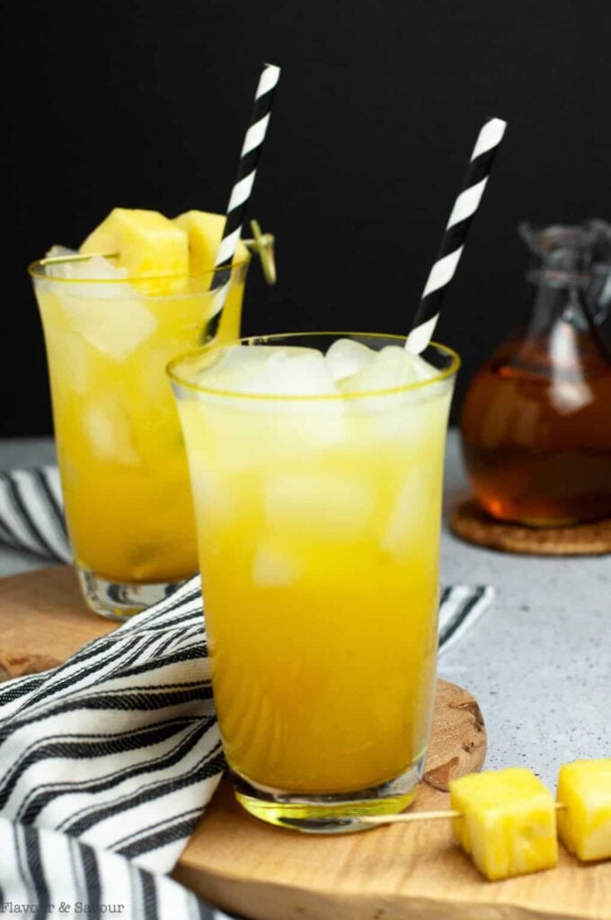 Fresh pineapple juice tastes sweeter than canned versions and contains more natural acidity. Start with less simple syrup than recipes suggest, then add more if needed.