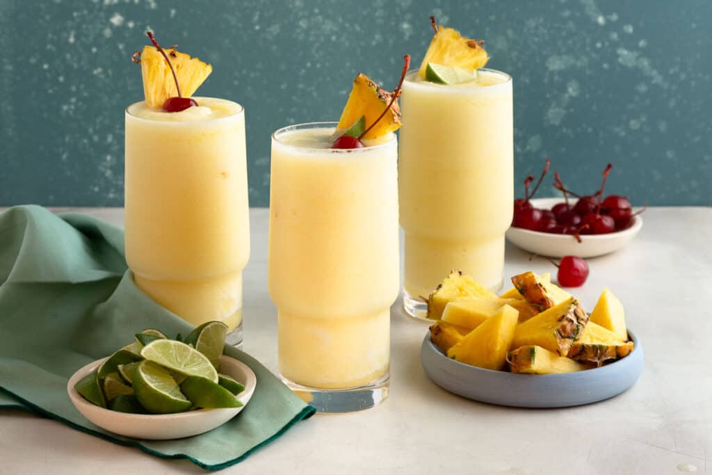 Coconut cream creates creamy texture in drinks like Piña Coladas. Citrus juices like lime or lemon add brightness and cut through pineapple’s sugar content.