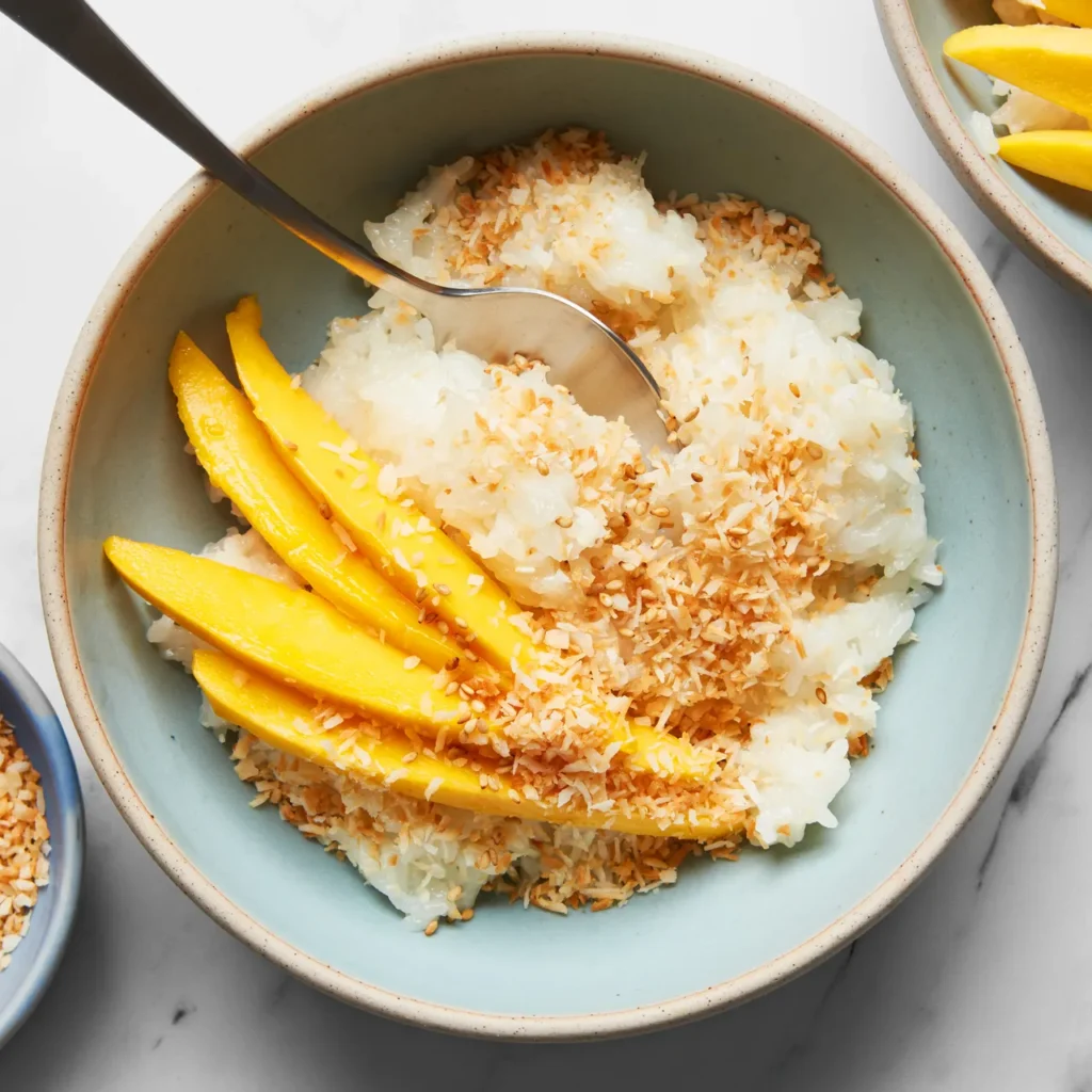 Coconut milk sticky rice transforms glutinous rice into a creamy, flavorful side dish. You’ll need sticky rice, coconut milk, water, and a pinch of salt.